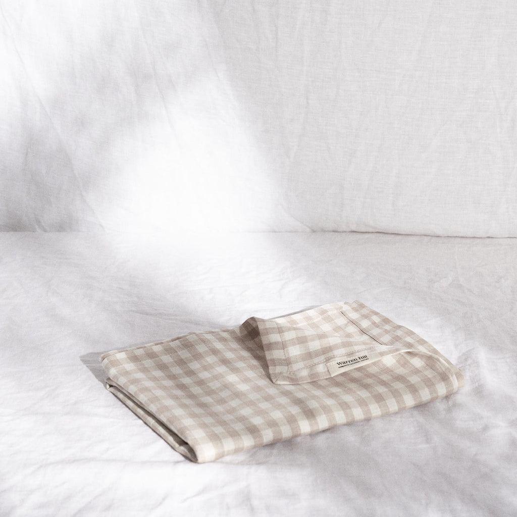 - Swaddle in Gingham Print – Lightweight and breathable French Linen, perfect for cuddles.