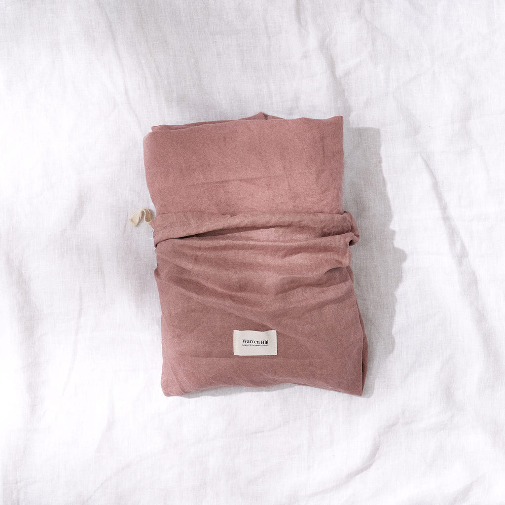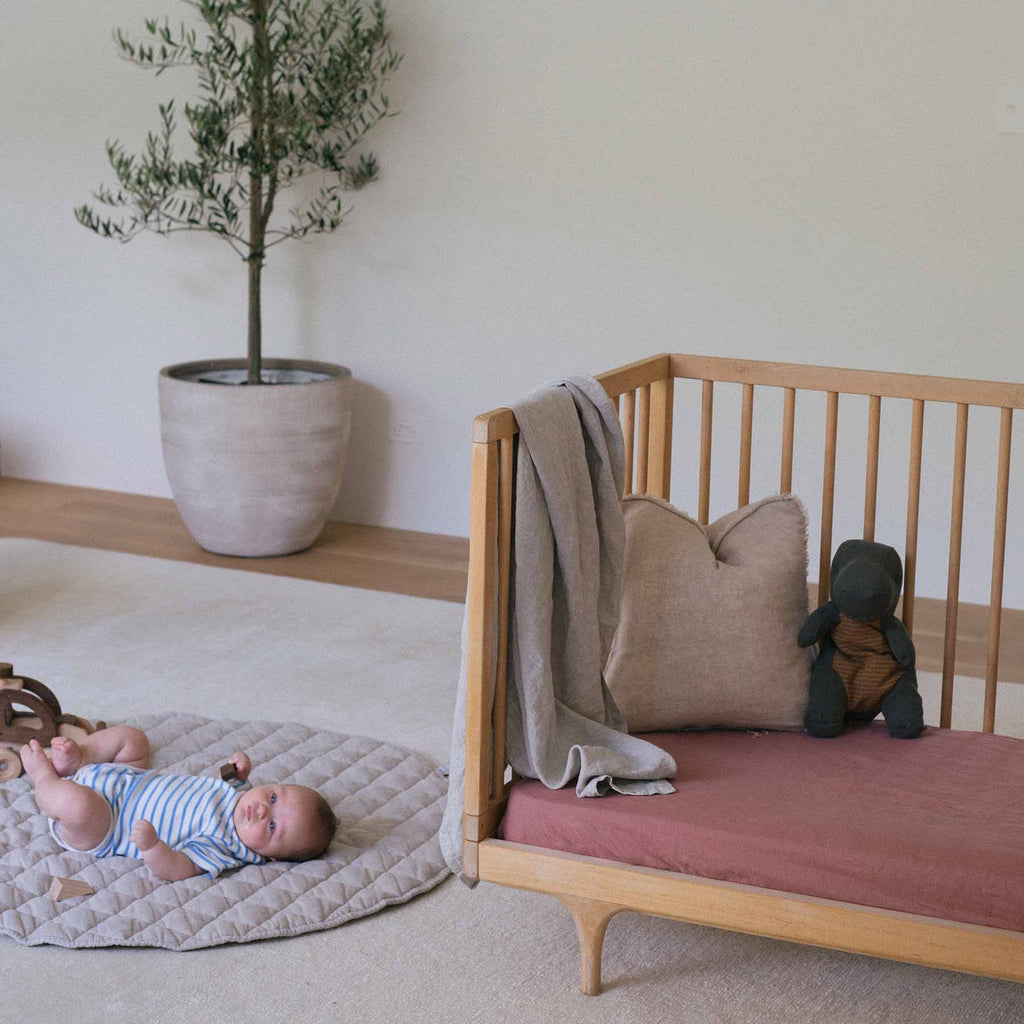 Made from the highest quality OKEO-tex certified French flax linen, our Smoke Pink colour fitted cot sheets are stonewashed to give them a soft, worn, vintage feel from the first time your little one lays on it.