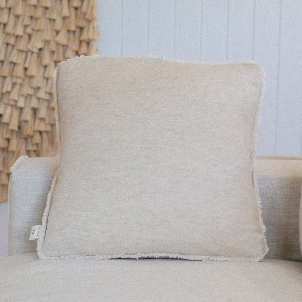 With an earthy linen-cotton gauze cover with fringed edges, handmade in Bali. To be lived with and loved by the whole family.
